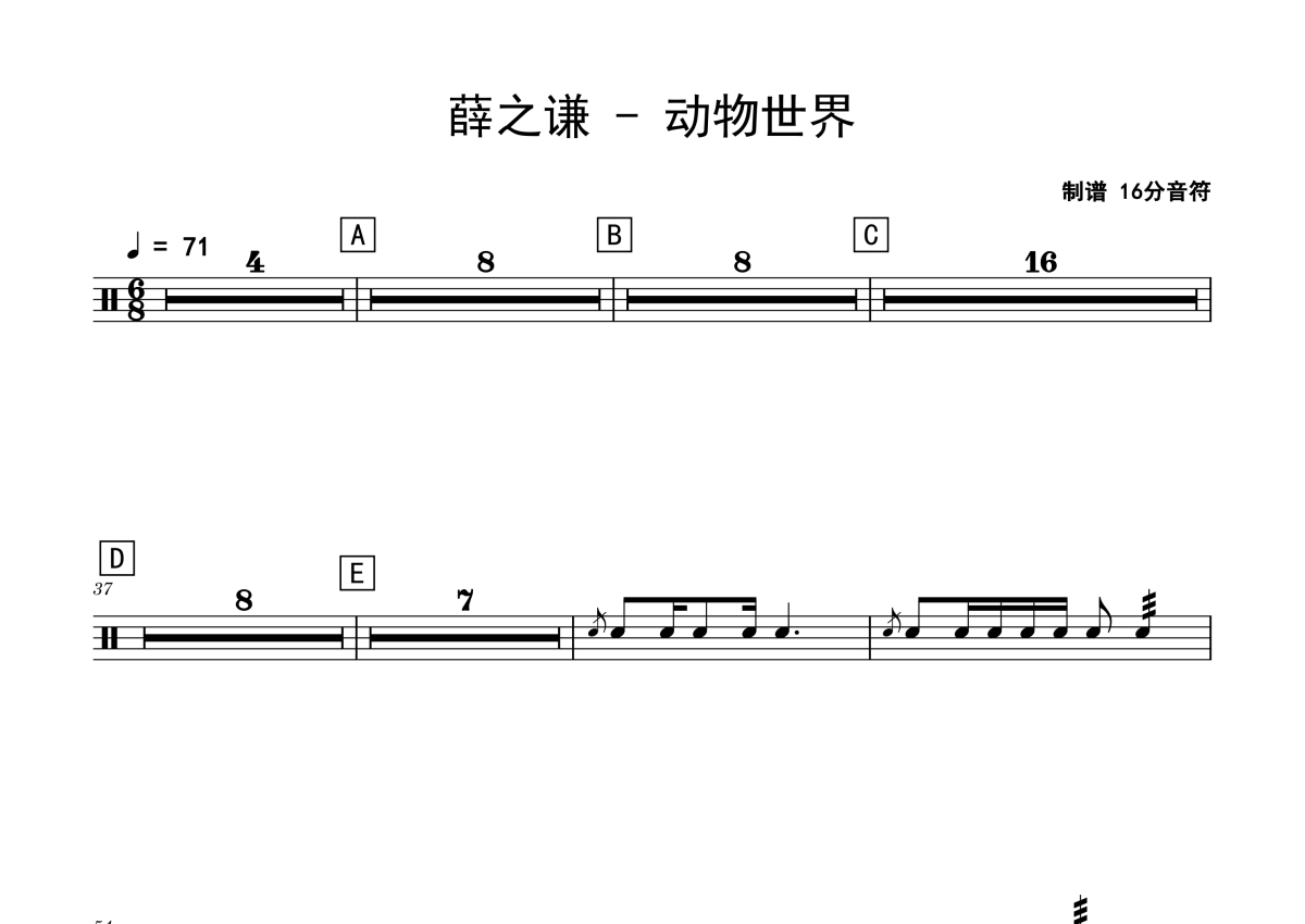 《动物世界》是薛之谦演唱的一首歌曲,拍号为4/4拍,歌曲速度为每分钟71拍,这份架子鼓谱共有两张高清图谱,图谱由 @Sawubona 编配上传,图谱使用五线谱编配,使用这份动物世界架子鼓谱,你将能够轻松地敲打出这首薛之谦的动物世界,快来尝试吧。