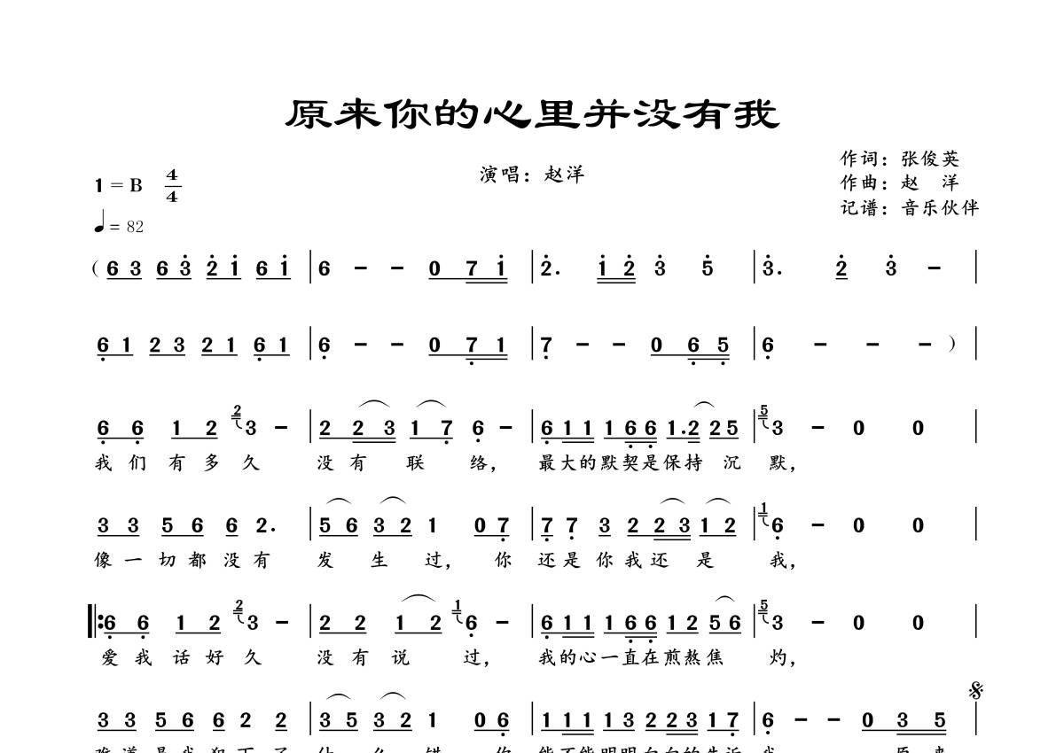《原来你的心里并没有我》是赵洋演唱的一首歌曲,拍号为4/4拍,歌曲速度为每分钟82拍,这份简谱共有一张高清图谱,图谱由 @音乐伙伴 编配上传。