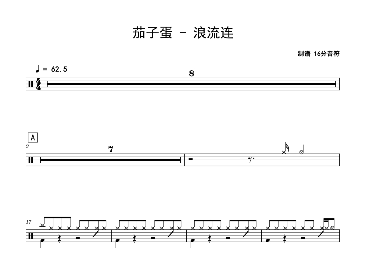 《浪流连》是茄子蛋演唱的一首歌曲,拍号为4/4拍,歌曲速度为每分钟62.5拍,这份架子鼓谱共有两张高清图谱,图谱由 @Sawubona 编配上传,图谱使用五线谱编配,使用这份浪流连架子鼓谱,你将能够轻松地敲打出这首茄子蛋的浪流连,快来尝试吧。