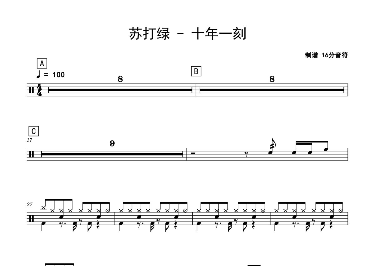 《十年一刻》是苏打绿演唱的一首歌曲,拍号为4/4拍,歌曲速度为每分钟100拍,这份架子鼓谱共有三张高清图谱,图谱由 @Sawubona 编配上传,图谱使用五线谱编配,使用这份十年一刻架子鼓谱,你将能够轻松地敲打出这首苏打绿的十年一刻,快来尝试吧。