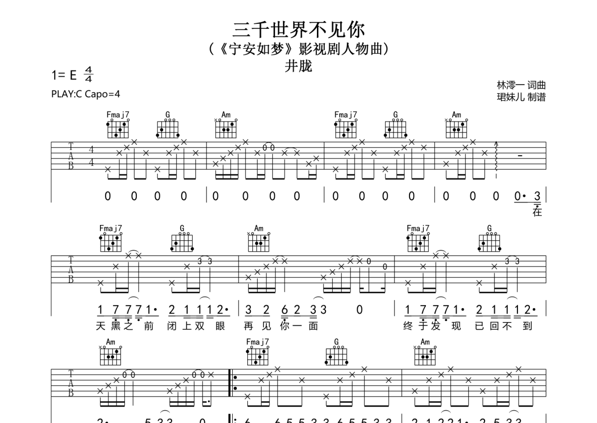《三千世界不见你》是井胧演唱的一首歌曲,拍号为4/4拍,歌曲速度为每分钟85拍,歌曲原调为E调,但由于原调指法比较难,为了方便弹奏,本吉他谱采用的是C调指法编配,变调夹4品弹奏即为原调,当然也可以根据自己的音域改变变调夹位置,或者通过改变和弦调性,以方便自己弹奏,这份吉他谱共有两张高清图谱,图谱由 @珺妹儿 编配上传,图谱使用六线谱编配,包含吉他和弦指法、简谱以及歌词部分,使用这份三千世界不见你吉他谱,可以让你更加方便地掌握这首歌曲的弹唱技巧,快来尝试吧。