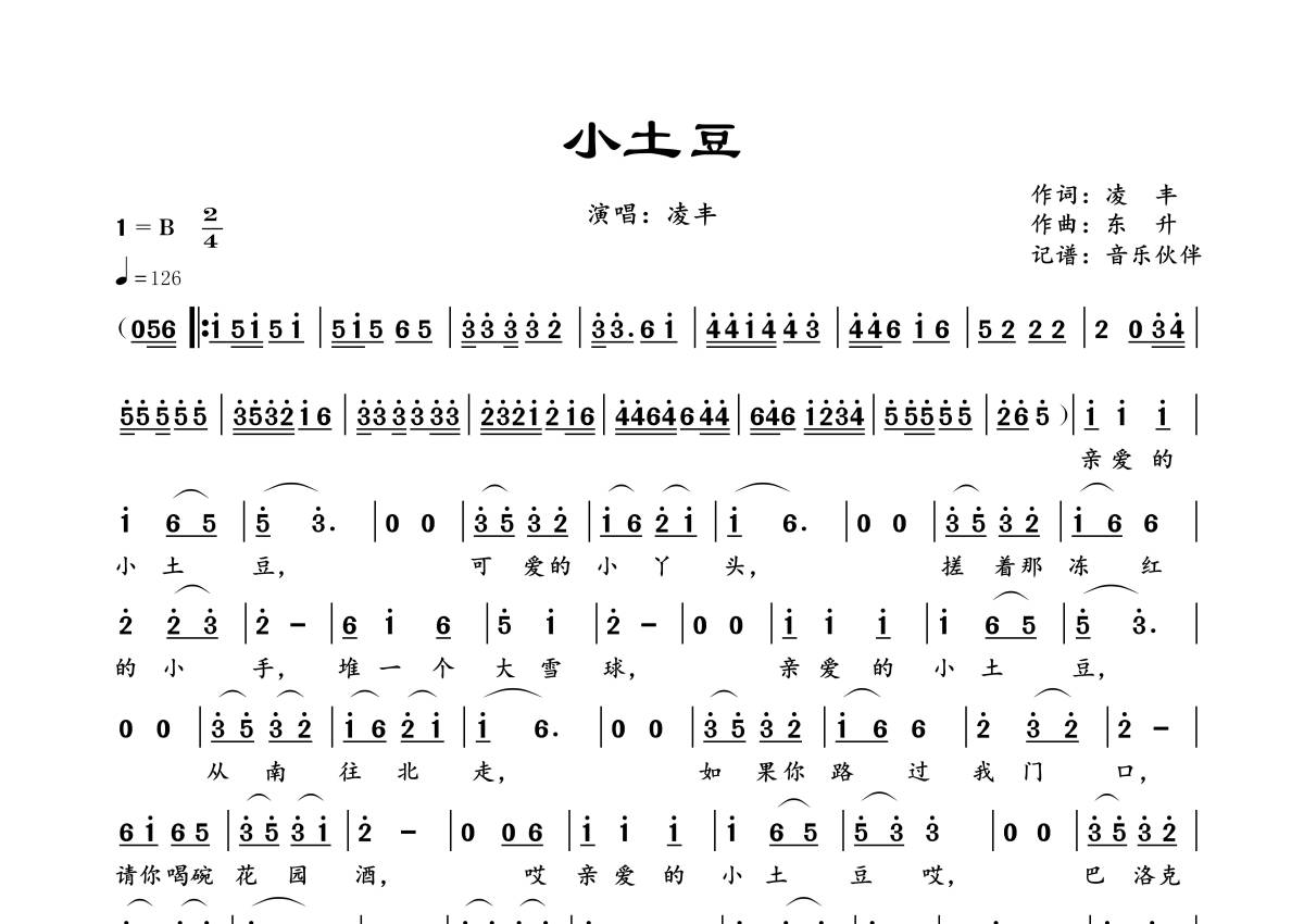 《小土豆》是凌丰演唱的一首歌曲,拍号为2/4拍,歌曲速度为每分钟126拍,这份简谱共有一张高清图谱,图谱由 @音乐伙伴 编配上传。