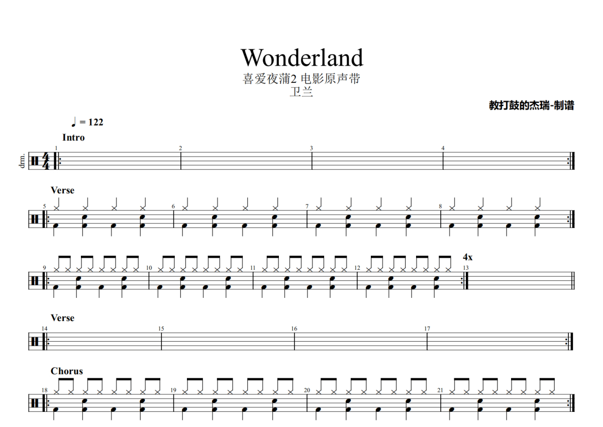 《Wonderland》是卫兰演唱的一首歌曲,拍号为4/4拍,歌曲速度为每分钟122拍,这份架子鼓谱共有两张高清图谱,图谱由 @Jerry 编配上传,图谱使用五线谱编配,使用这份Wonderland架子鼓谱,你将能够轻松地敲打出这首卫兰的Wonderland,快来尝试吧。