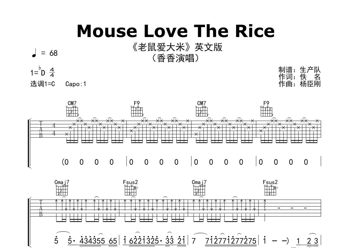 《Mouse Love The Rice》是香香演唱的一首歌曲,精编完美版,拍号为4/4拍,歌曲速度为每分钟68拍,歌曲原调为Db调,但由于原调指法比较难,为了方便弹奏,本吉他谱采用的是C调指法编配,变调夹1品弹奏即为原调,当然也可以根据自己的音域改变变调夹位置,或者通过改变和弦调性,以方便自己弹奏,这份吉他谱共有三张高清图谱,图谱由 @生产队 编配上传,图谱使用六线谱编配,包含吉他和弦指法、简谱以及歌词部分,使用这份Mouse Love The Rice吉他谱,可以让你更加方便地掌握这首歌曲的弹唱技巧,快来尝试吧。《Mouse Love The Rice》是由香香演唱的经典歌曲《老鼠爱大米》(英文版)。本吉他谱根据原版C调指法编配,完整的前奏、间奏编配,怀旧经典!。
