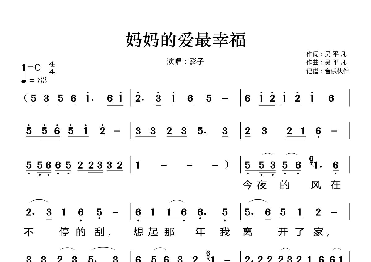 《妈妈的爱最幸福》是影子演唱的一首歌曲,拍号为4/4拍,歌曲速度为每分钟83拍,这份简谱共有两张高清图谱,图谱由 @音乐伙伴 编配上传。