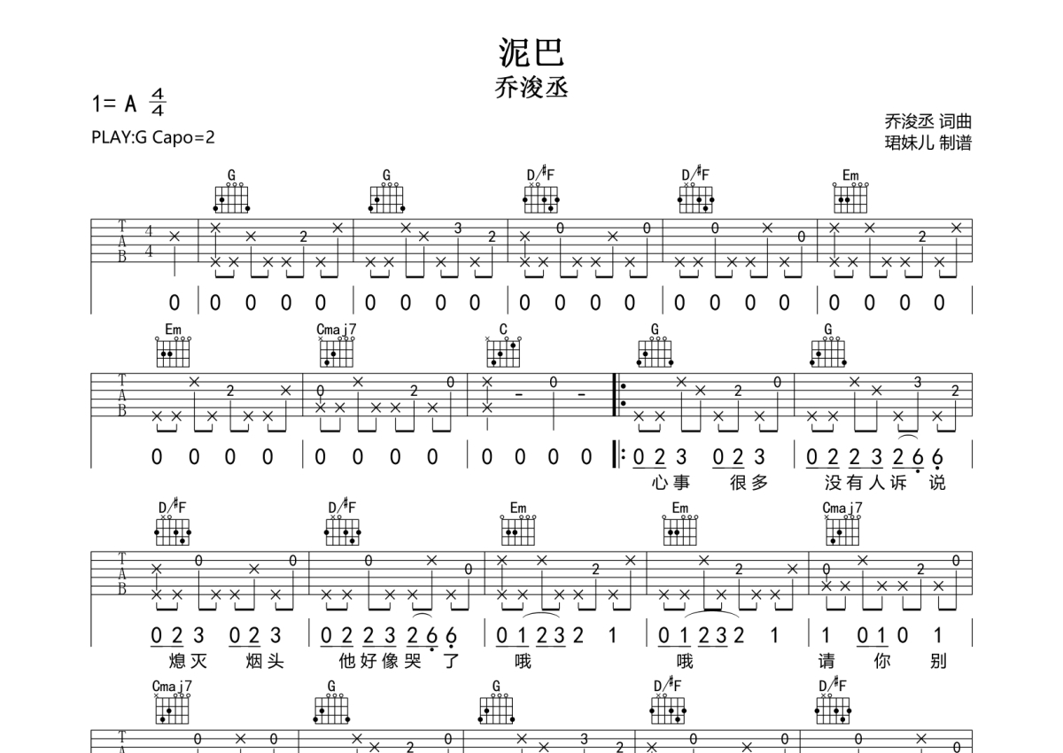 《泥巴》是乔浚丞演唱的一首歌曲,拍号为4/4拍,歌曲速度为每分钟85拍,歌曲原调为A调,但由于原调指法比较难,为了方便弹奏,本吉他谱采用的是G调指法编配,变调夹2品弹奏即为原调,当然也可以根据自己的音域改变变调夹位置,或者通过改变和弦调性,以方便自己弹奏,这份吉他谱共有三张高清图谱,图谱由 @珺妹儿 编配上传,图谱使用六线谱编配,包含吉他和弦指法、简谱以及歌词部分,使用这份泥巴吉他谱,可以让你更加方便地掌握这首歌曲的弹唱技巧,快来尝试吧。