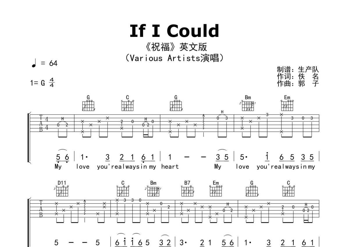 《If I Could《祝福》(英文版)》是英文版演唱的一首歌曲,精编完美版,本吉他谱采用的是G调指法编配,这份吉他谱共有四张高清图谱,图谱由 @生产队 编配上传,图谱使用六线谱编配,包含吉他和弦指法、简谱以及歌词部分,使用这份If I Could《祝福》(英文版)吉他谱,可以让你更加方便地掌握这首歌曲的弹唱技巧,快来尝试吧。《If I Could》是由Various Artists翻唱的张学友经典歌曲《祝福》(英文版)。本吉他谱根据原版G调指法编配,完整的前奏、间奏和SOLO编配,致敬经典!。