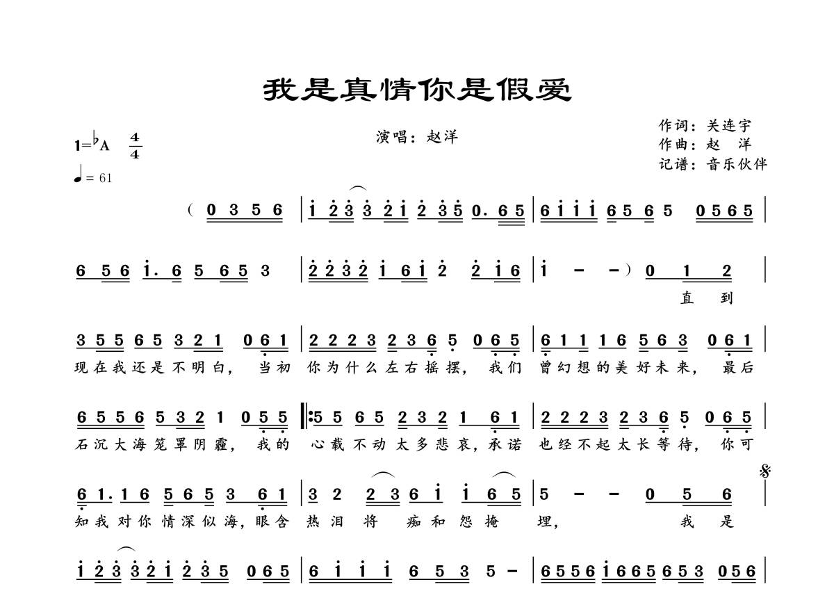 《我是真情你是假爱》是赵洋演唱的一首歌曲,拍号为4/4拍,歌曲速度为每分钟61拍,这份简谱共有一张高清图谱,图谱由 @音乐伙伴 编配上传。