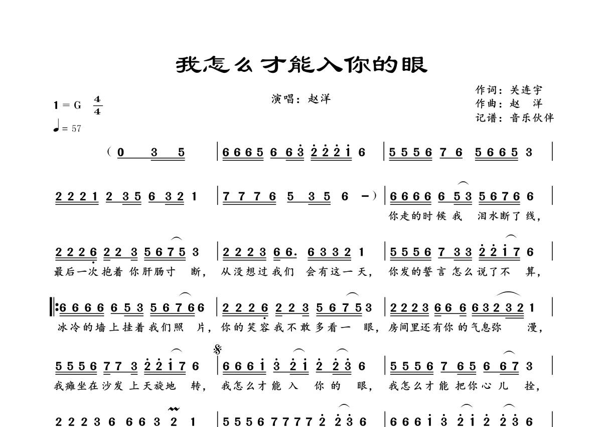 《我怎么才能入你的眼》是赵洋演唱的一首歌曲,拍号为4/4拍,歌曲速度为每分钟57拍,这份简谱共有一张高清图谱,图谱由 @音乐伙伴 编配上传。