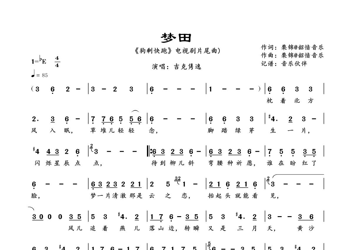 《梦田》是吉克隽逸演唱的一首歌曲,拍号为4/4拍,歌曲速度为每分钟85拍,这份简谱共有一张高清图谱,图谱由 @音乐伙伴 编配上传《狗剩快跑》电视剧片尾曲)。