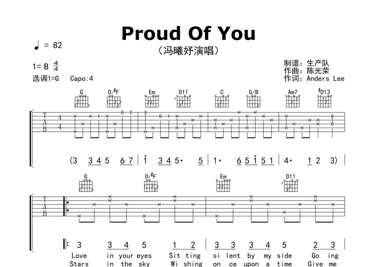 《Proud Of You》是冯曦妤演唱的一首歌曲,精编完美版,拍号为4/4拍,歌曲速度为每分钟82拍,歌曲原调为B调,但由于原调指法比较难,为了方便弹奏,本吉他谱采用的是G调指法编配,变调夹4品弹奏即为原调,当然也可以根据自己的音域改变变调夹位置,或者通过改变和弦调性,以方便自己弹奏,这份吉他谱共有三张高清图谱,图谱由 @生产队 编配上传,图谱使用六线谱编配,包含吉他和弦指法、简谱以及歌词部分,使用这份Proud Of You吉他谱,可以让你更加方便地掌握这首歌曲的弹唱技巧,快来尝试吧。《Proud Of You》是一首由陈光荣作曲,Anders Lee作词的歌,冯曦妤演唱的经典歌曲。本吉他谱根据原版G调指法编配,精准的前奏、间奏、尾奏和SOLO编配,致敬经典!。