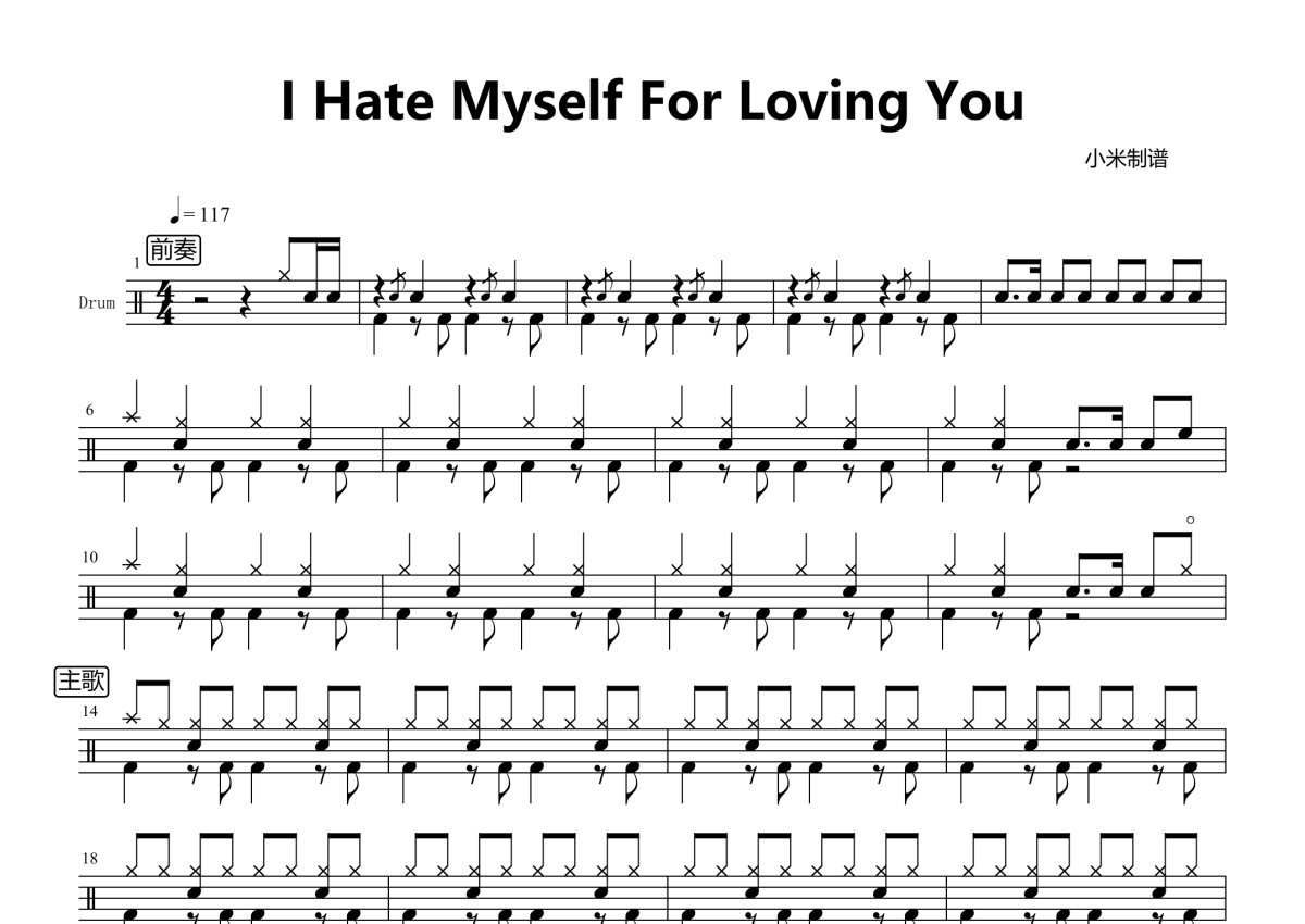 《I Hate Myself for Loving You》是Joan Jett & the Blackhearts演唱的一首歌曲,演出版,拍号为4/4拍,歌曲速度为每分钟117拍,这份架子鼓谱共有三张高清图谱,图谱由 @小米鼓谱 编配上传,图谱使用五线谱编配,使用这份I Hate Myself for Loving You架子鼓谱,你将能够轻松地敲打出这首Joan Jett & the Blackhearts的I Hate Myself for Loving You,快来尝试吧。