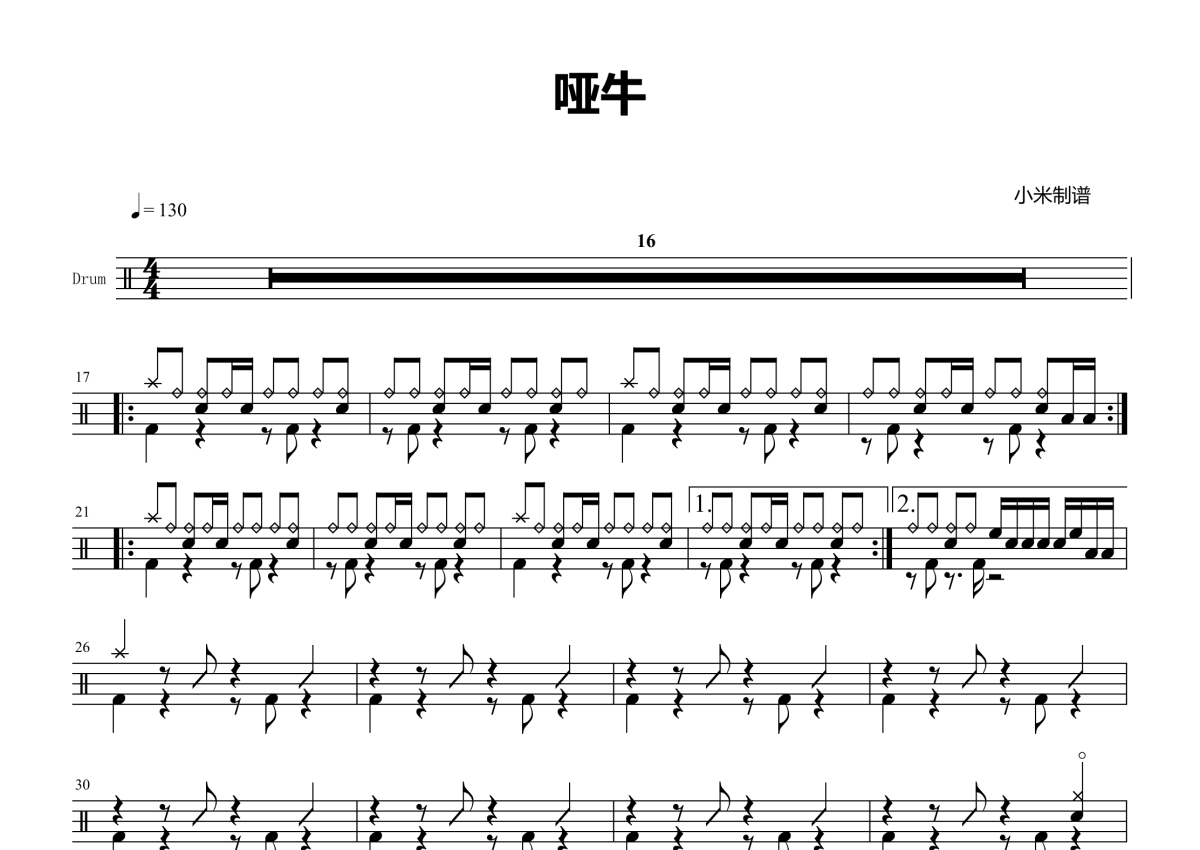 《哑牛》是蛙池演唱的一首歌曲,拍号为4/4拍,歌曲速度为每分钟128拍,这份架子鼓谱共有两张高清图谱,图谱由 @小米鼓谱 编配上传,图谱使用五线谱编配,使用这份哑牛架子鼓谱,你将能够轻松地敲打出这首蛙池的哑牛,快来尝试吧。