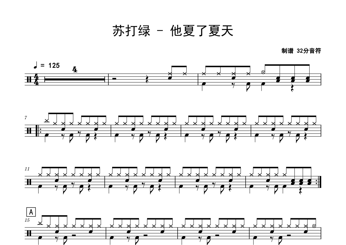 《他夏了夏天》是苏打绿演唱的一首歌曲,拍号为4/4拍,歌曲速度为每分钟125拍,这份架子鼓谱共有四张高清图谱,图谱由 @Sawubona 编配上传,图谱使用五线谱编配,使用这份他夏了夏天架子鼓谱,你将能够轻松地敲打出这首苏打绿的他夏了夏天,快来尝试吧。