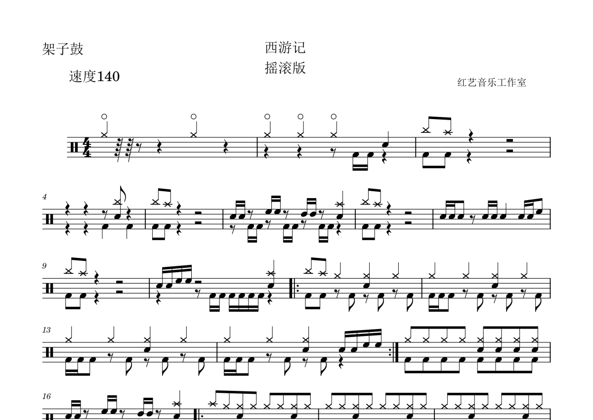 《西游记》是喻喜亮演唱的一首歌曲,摇滚版,拍号为4/4拍,歌曲速度为每分钟140拍,这份架子鼓谱共有两张高清图谱,图谱由 @꧁汶歌꧂ 编配上传,图谱使用五线谱编配,使用这份西游记架子鼓谱,你将能够轻松地敲打出这首喻喜亮的西游记,快来尝试吧。