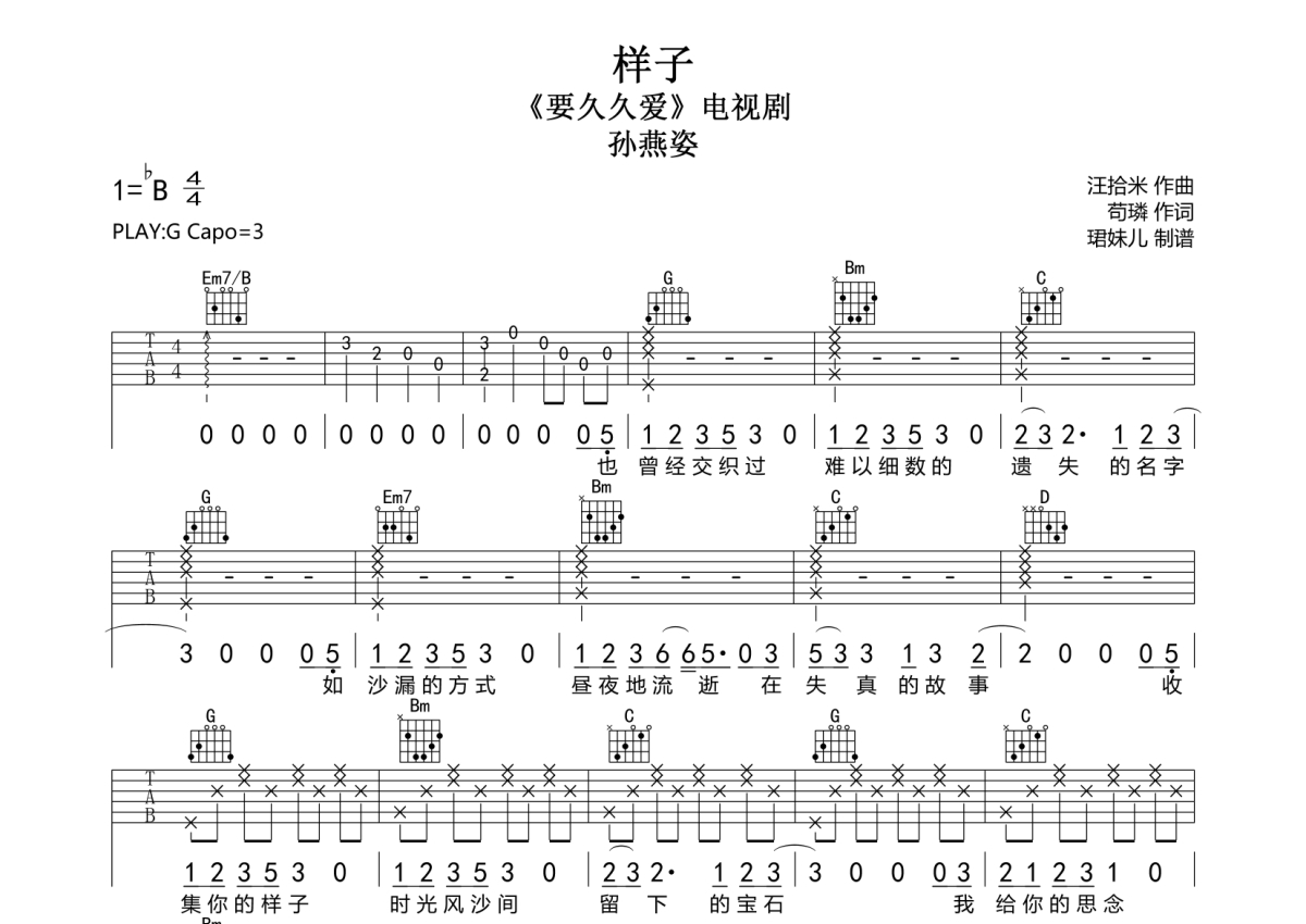 《样子》是孙燕姿演唱的一首歌曲,拍号为4/4拍,歌曲速度为每分钟85拍,歌曲原调为Bb调,但由于原调指法比较难,为了方便弹奏,本吉他谱采用的是G调指法编配,变调夹3品弹奏即为原调,当然也可以根据自己的音域改变变调夹位置,或者通过改变和弦调性,以方便自己弹奏,这份吉他谱共有三张高清图谱,图谱由 @珺妹儿 编配上传,图谱使用六线谱编配,包含吉他和弦指法、简谱以及歌词部分,使用这份样子吉他谱,可以让你更加方便地掌握这首歌曲的弹唱技巧,快来尝试吧。