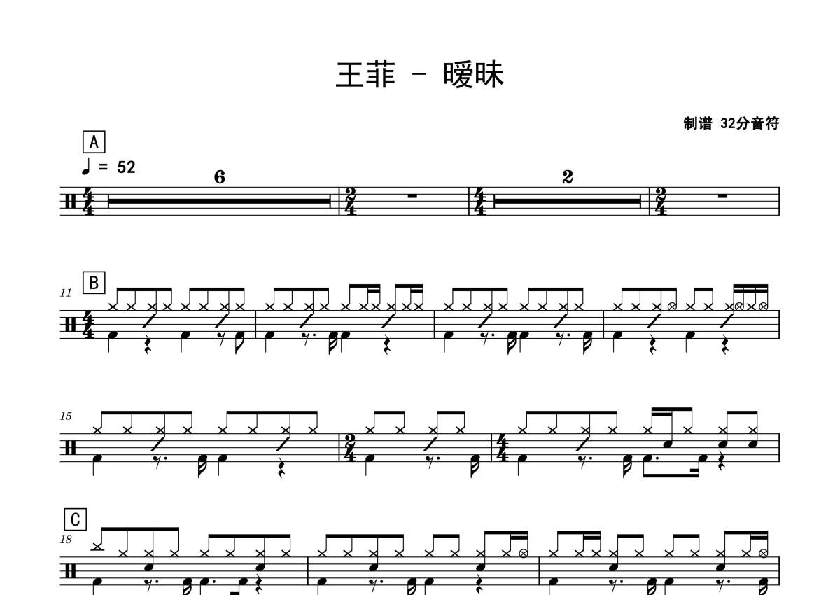 《暧昧》是王菲演唱的一首歌曲,拍号为4/4拍,歌曲速度为每分钟52拍,这份架子鼓谱共有两张高清图谱,图谱由 @Sawubona 编配上传,图谱使用五线谱编配,使用这份暧昧架子鼓谱,你将能够轻松地敲打出这首王菲的暧昧,快来尝试吧。