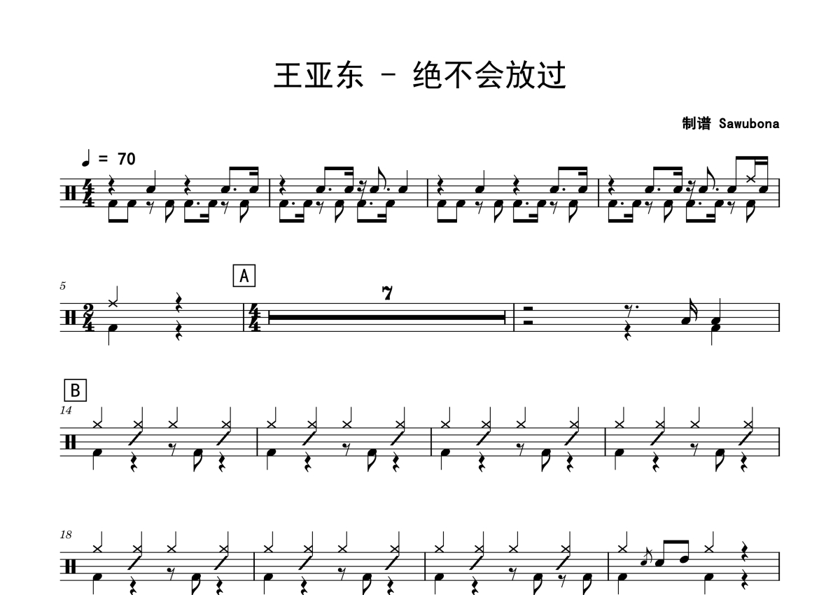 《绝不会放过》是王亚东演唱的一首歌曲,拍号为4/4拍,歌曲速度为每分钟70拍,这份架子鼓谱共有两张高清图谱,图谱由 @Sawubona 编配上传,图谱使用五线谱编配,使用这份绝不会放过架子鼓谱,你将能够轻松地敲打出这首王亚东的绝不会放过,快来尝试吧。