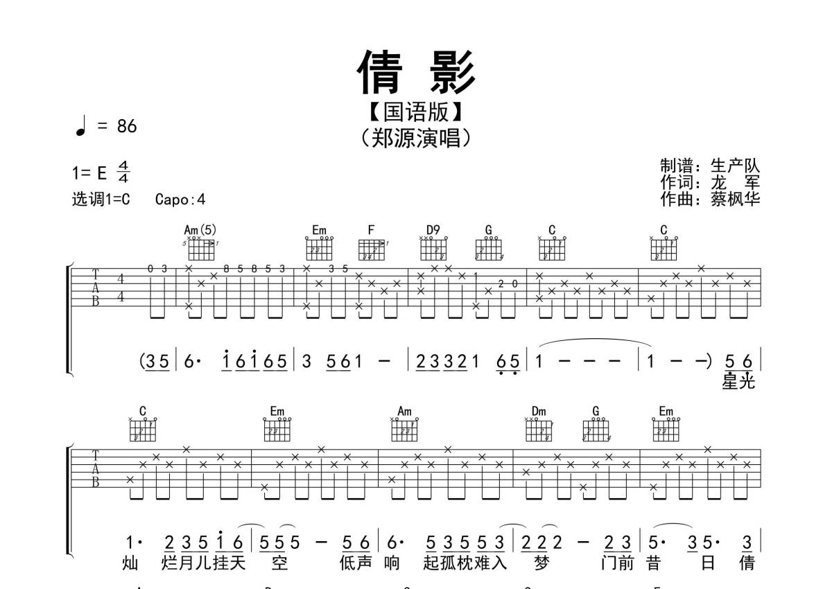 《倩影》是郑源演唱的一首歌曲,(国语版),拍号为4/4拍,歌曲速度为每分钟86拍,歌曲原调为E调,但由于原调指法比较难,为了方便弹奏,本吉他谱采用的是C调指法编配,变调夹4品弹奏即为原调,当然也可以根据自己的音域改变变调夹位置,或者通过改变和弦调性,以方便自己弹奏,这份吉他谱共有两张高清图谱,图谱由 @生产队 编配上传,图谱使用六线谱编配,包含吉他和弦指法、简谱以及歌词部分,使用这份倩影吉他谱,可以让你更加方便地掌握这首歌曲的弹唱技巧,快来尝试吧。《倩影》(国语版)是由蔡枫华作曲,龙军作词,郑源翻唱的一首经典情歌,郑源用他那富有磁性、沙哑的声音演唱这首歌,改编成国语可谓另一番音乐盛宴。本吉他谱根据原版C调指法编配,我知道的前奏、间奏和SOLO编配,怀旧经典!。