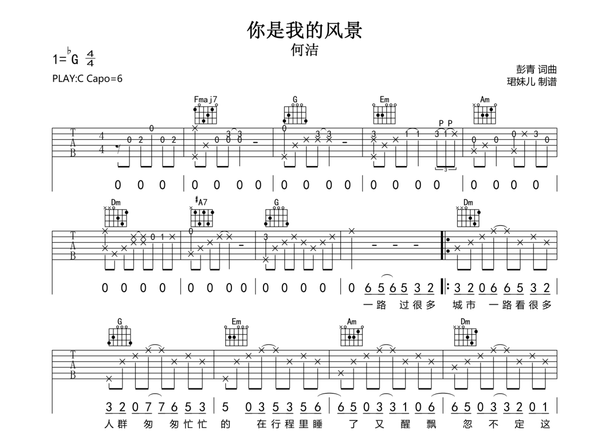 你是我的风景吉他谱 - 何洁 - C调弹唱六线谱
