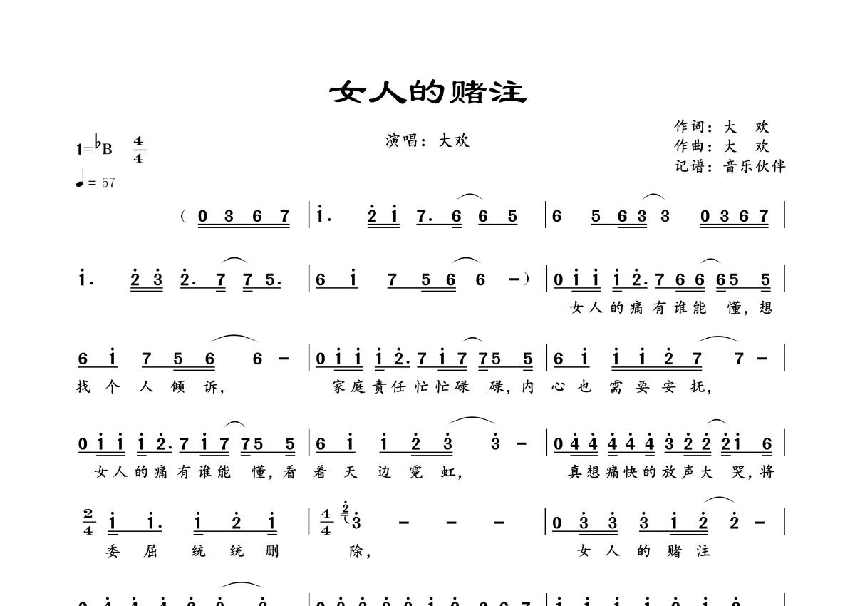 《女人的赌注》是大欢演唱的一首歌曲,拍号为4/4拍,歌曲速度为每分钟57拍,这份简谱共有一张高清图谱,图谱由 @音乐伙伴 编配上传。