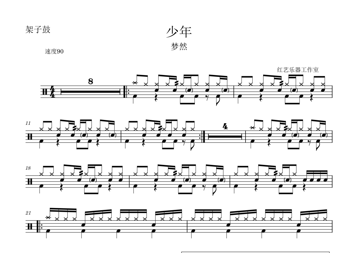 《少年》是梦然演唱的一首歌曲,五线谱,拍号为4/4拍,歌曲速度为每分钟90拍,这份架子鼓谱共有两张高清图谱,图谱由 @꧁汶歌꧂ 编配上传,图谱使用五线谱编配,使用这份少年架子鼓谱,你将能够轻松地敲打出这首梦然的少年,快来尝试吧。