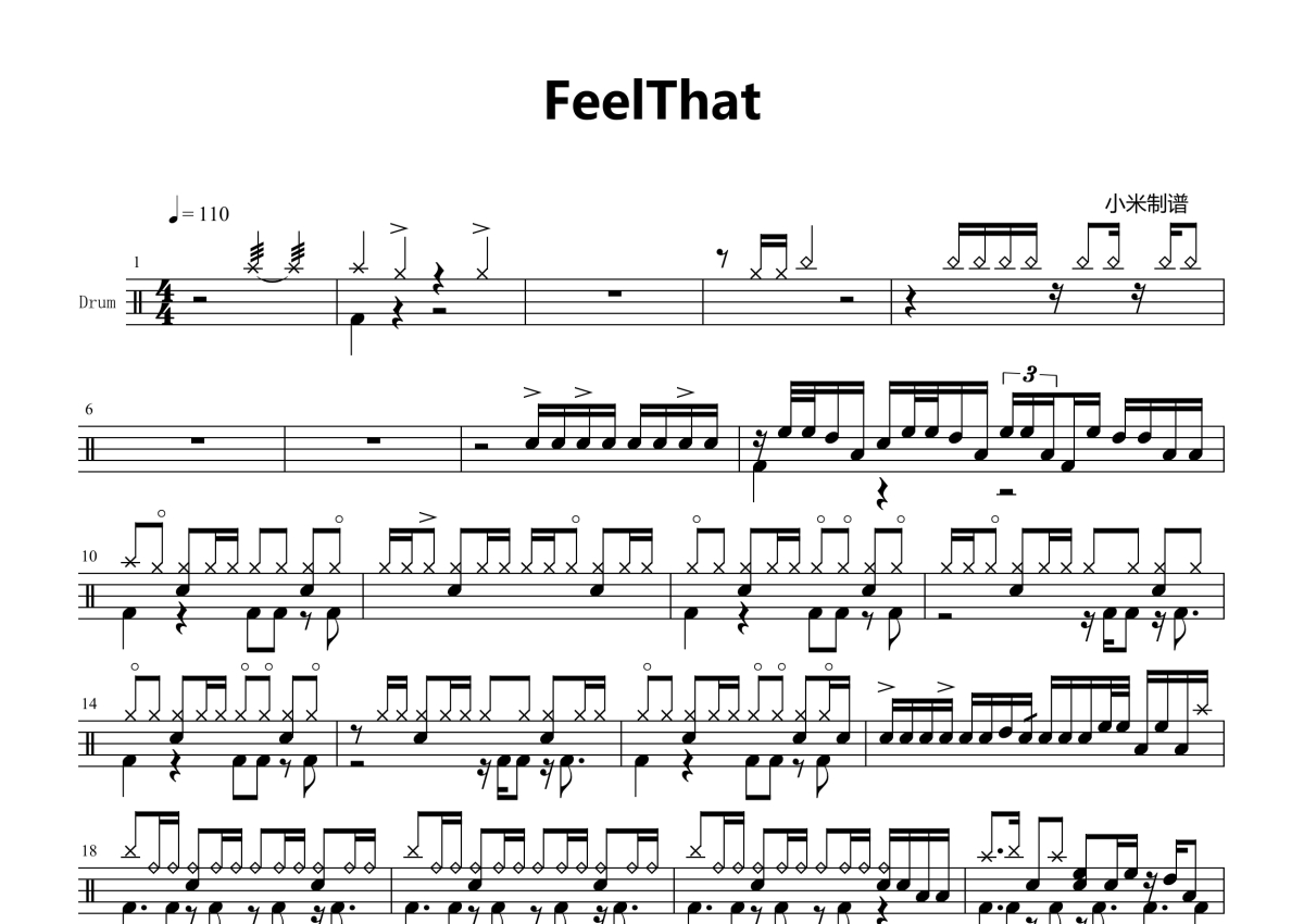 《FeelThat》是演出比赛曲目演唱的一首歌曲,拍号为4/4拍,歌曲速度为每分钟109拍,这份架子鼓谱共有三张高清图谱,图谱由 @小米鼓谱 编配上传,图谱使用五线谱编配,使用这份FeelThat架子鼓谱,你将能够轻松地敲打出这首演出比赛曲目的FeelThat,快来尝试吧。