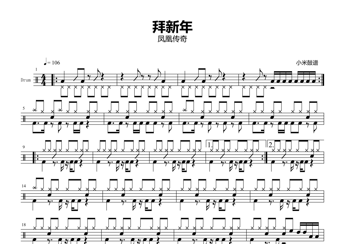 《拜新年》是凤凰传奇演唱的一首歌曲,拍号为4/4拍,歌曲速度为每分钟106拍,这份架子鼓谱共有两张高清图谱,图谱由 @小米鼓谱 编配上传,图谱使用五线谱编配,使用这份拜新年架子鼓谱,你将能够轻松地敲打出这首凤凰传奇的拜新年,快来尝试吧。
