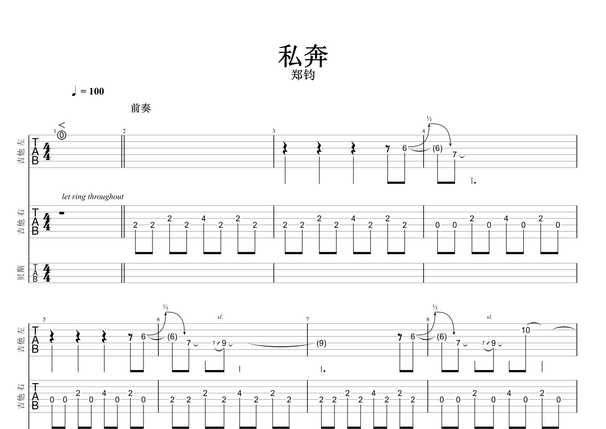 《私奔》是郑钧演唱的一首歌曲,石头音乐原版记谱,歌曲速度为每分钟100拍,歌曲原调为A调,这份电吉他谱共有九张高清图谱,图谱由 @石头音乐 编配上传,图谱使用六线谱编配,曲谱配备了相关的音频提供试听,使用这份私奔电吉他谱,可以让你更加方便地掌握这首歌曲的演奏技巧,快来尝试吧。两把吉他,贝斯,带GTP。