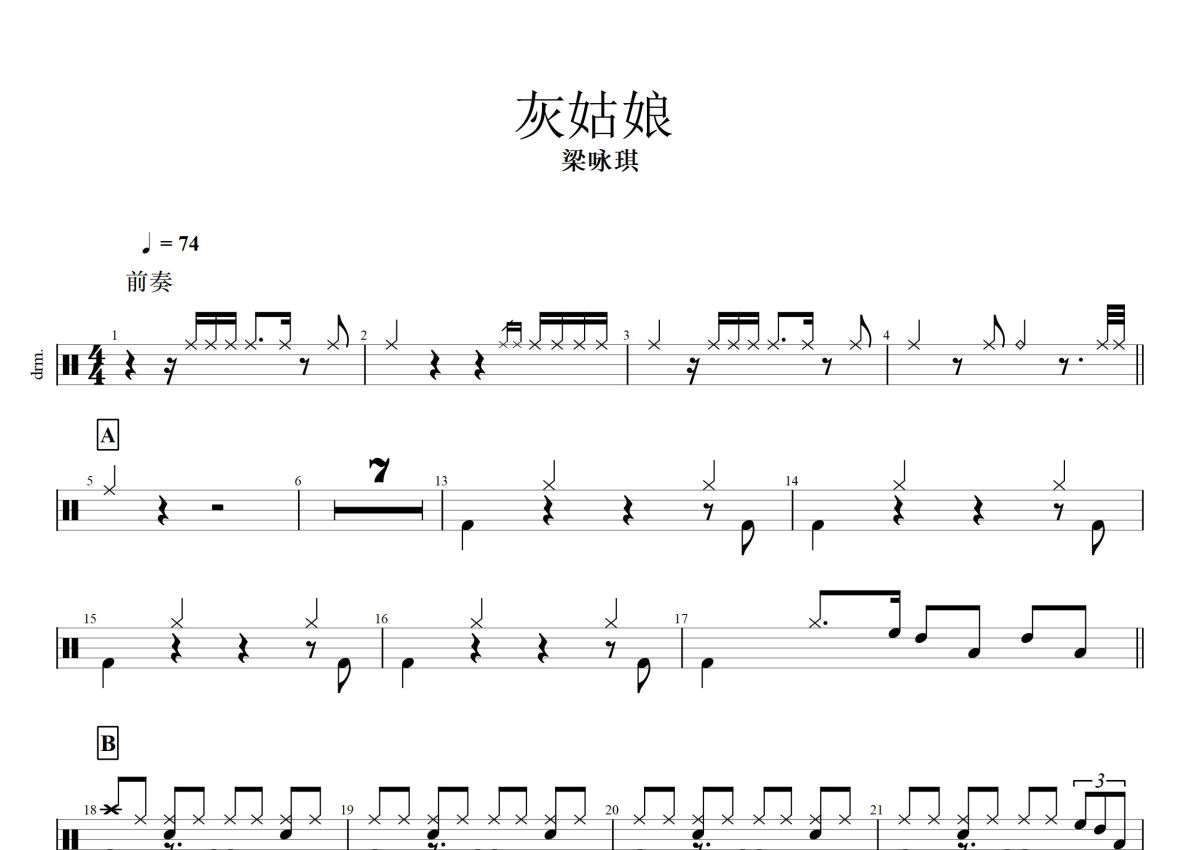 《灰姑娘》是梁咏琪演唱的一首歌曲,这份鼓谱共有两张高清图谱,图谱由 @打鼓谱 编配上传,图谱使用五线谱编配,使用这份灰姑娘架子鼓谱,你将能够轻松地敲打出这首梁咏琪的灰姑娘,快来尝试吧。《灰姑娘》是梁咏琪演唱的歌曲,2000年12月01日发行。