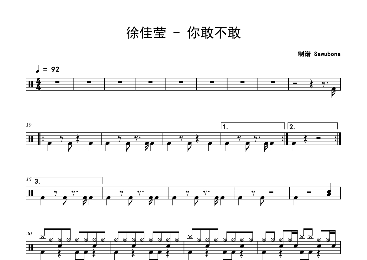 《你敢不敢》是徐佳莹演唱的一首歌曲,这份架子鼓谱共有两张高清图谱,图谱由 @Sawubona 编配上传,图谱使用五线谱编配,使用这份你敢不敢架子鼓谱,你将能够轻松地敲打出这首徐佳莹的你敢不敢,快来尝试吧。