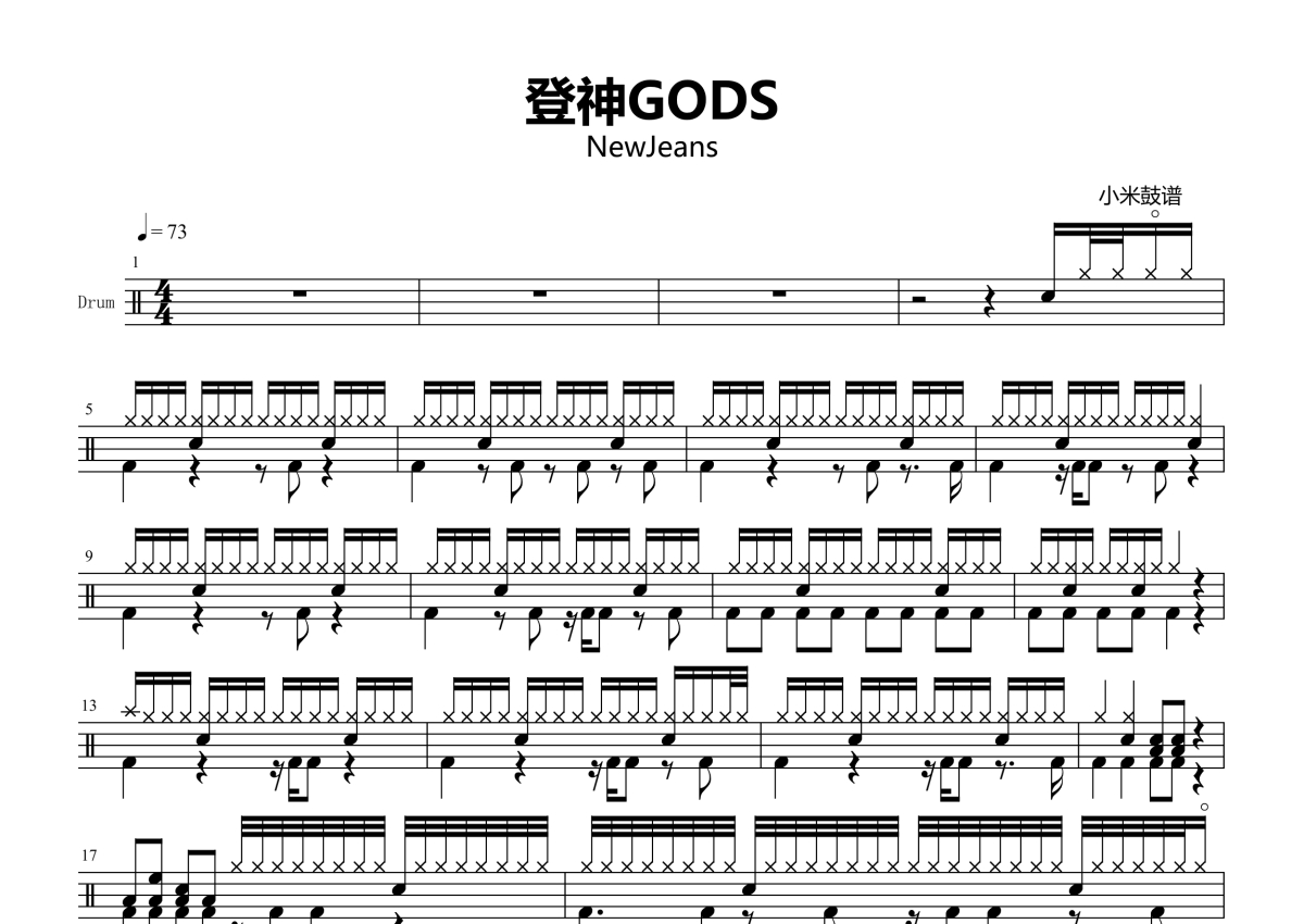 《登神GODS》是NewJeans演唱的一首歌曲,拍号为4/4拍,歌曲速度为每分钟73拍,这份架子鼓谱共有两张高清图谱,图谱由 @小米鼓谱 编配上传,图谱使用五线谱编配,使用这份登神GODS架子鼓谱,你将能够轻松地敲打出这首NewJeans的登神GODS,快来尝试吧。