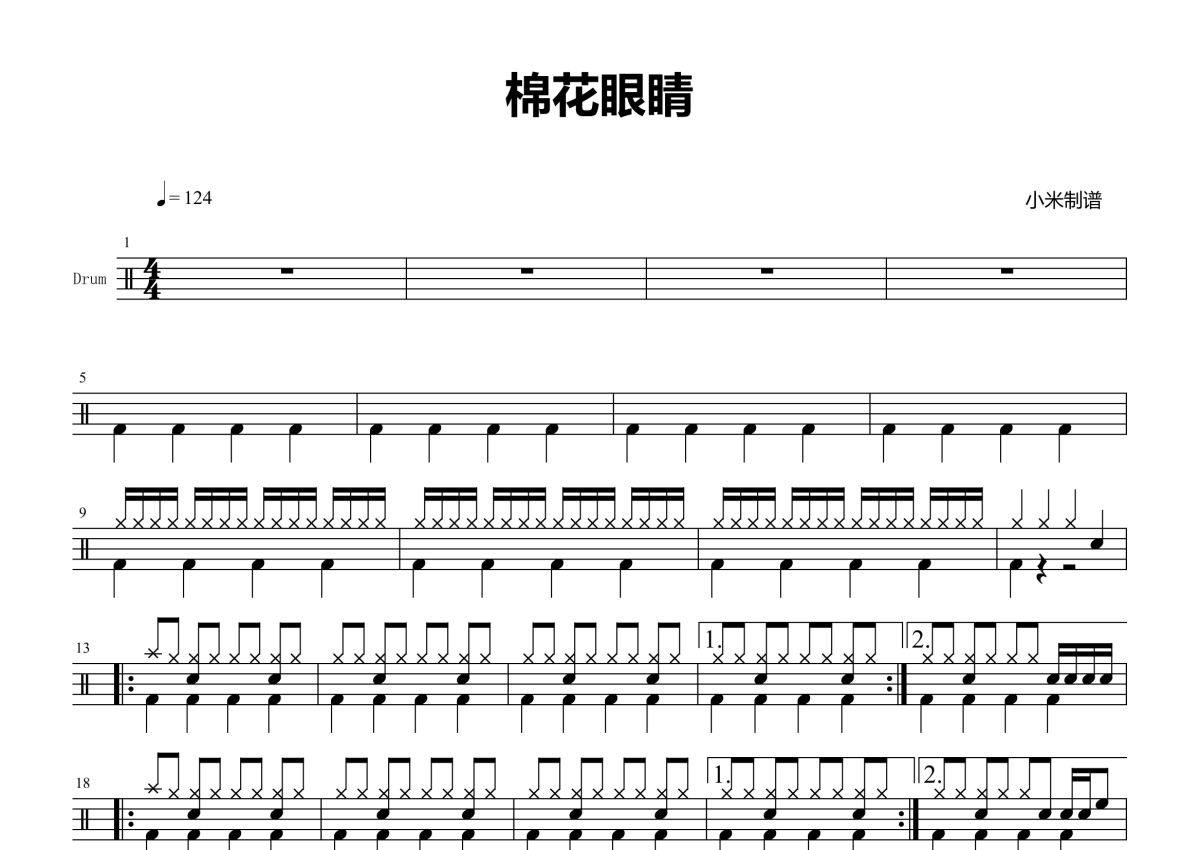 《棉花眼睛》是演出比赛版演唱的一首歌曲,拍号为4/4拍,歌曲速度为每分钟124拍,这份架子鼓谱共有两张高清图谱,图谱由 @小米鼓谱 编配上传,图谱使用五线谱编配,使用这份棉花眼睛架子鼓谱,你将能够轻松地敲打出这首演出比赛版的棉花眼睛,快来尝试吧。