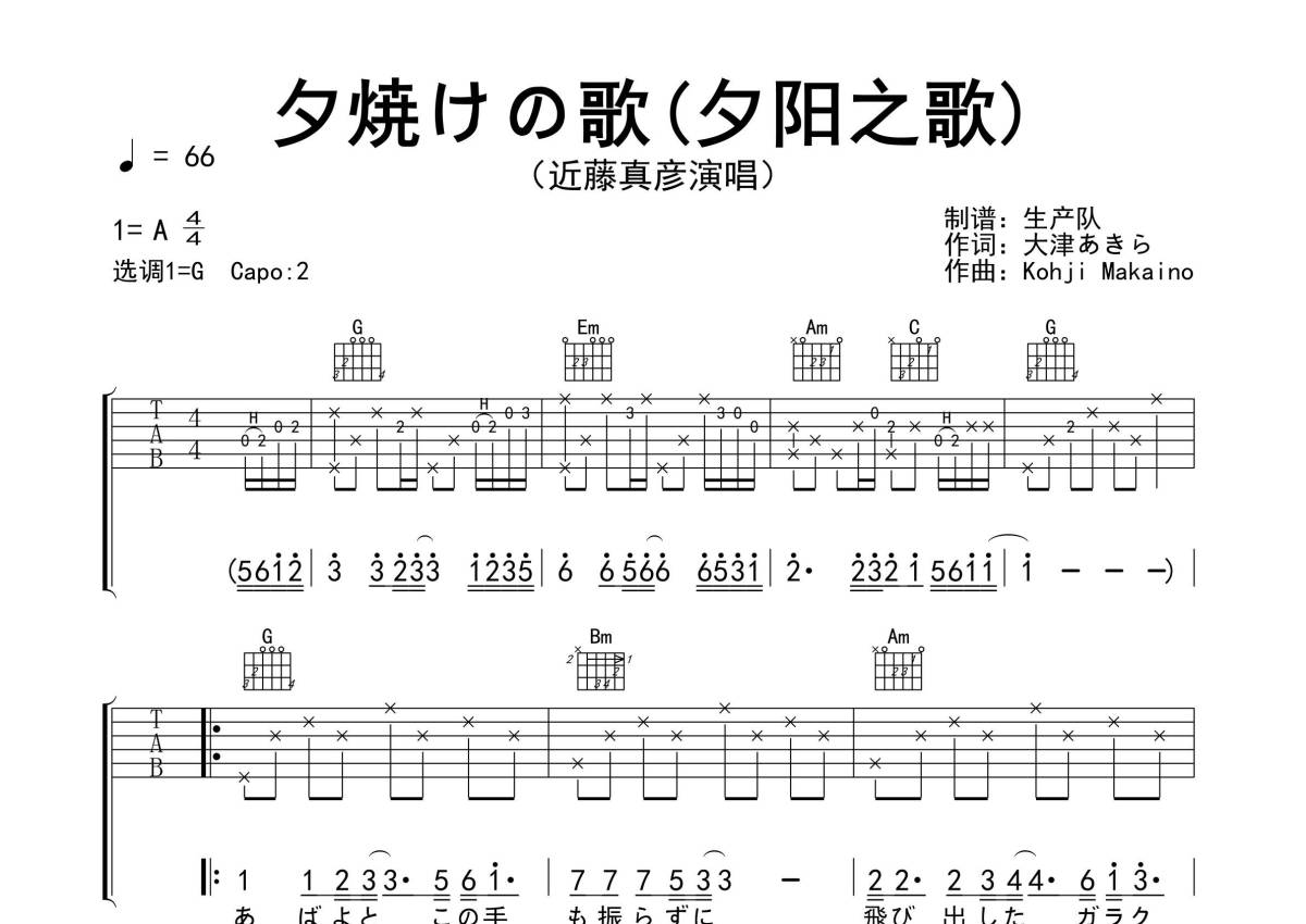 《夕焼けの歌 (夕阳之歌)》是近藤真彦演唱的一首歌曲,精编完美版,拍号为4/4拍,歌曲速度为每分钟66拍,歌曲原调为A调,但由于原调指法比较难,为了方便弹奏,本吉他谱采用的是G调指法编配,变调夹2品弹奏即为原调,当然也可以根据自己的音域改变变调夹位置,或者通过改变和弦调性,以方便自己弹奏,这份吉他谱共有三张高清图谱,图谱由 @生产队 编配上传,图谱使用六线谱编配,包含吉他和弦指法、简谱以及歌词部分,使用这份夕焼けの歌 (夕阳之歌)吉他谱,可以让你更加方便地掌握这首歌曲的弹唱技巧,快来尝试吧。《夕焼けの歌》(夕阳之歌)是日本歌手近藤真彦的第29张日语单曲,由日本索尼唱片于1989年2月3日发行。本吉他谱根据原版G调指法编配,完整的前奏、间奏、尾奏和SOLO编配,怀旧经典!。