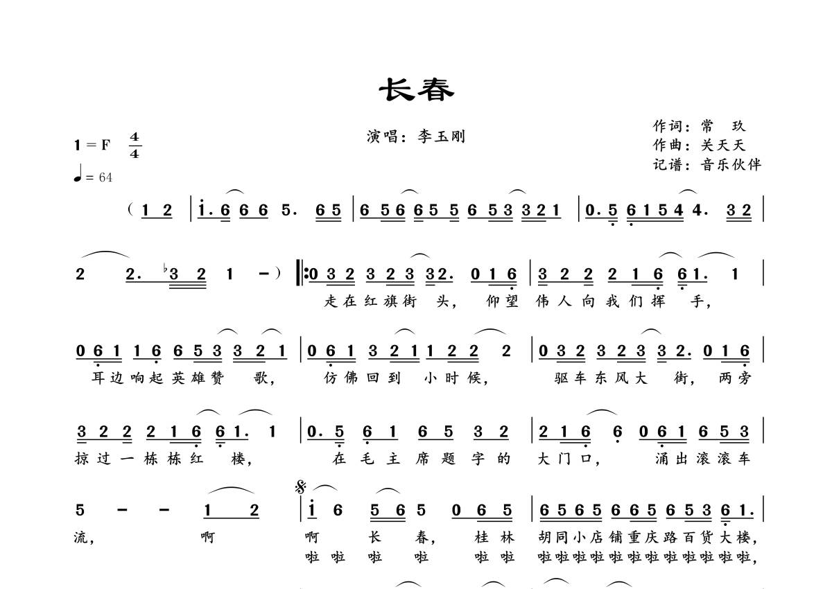《长春》是李玉刚演唱的一首歌曲,拍号为4/4拍,歌曲速度为每分钟64拍,这份简谱共有一张高清图谱,图谱由 @音乐伙伴 编配上传。