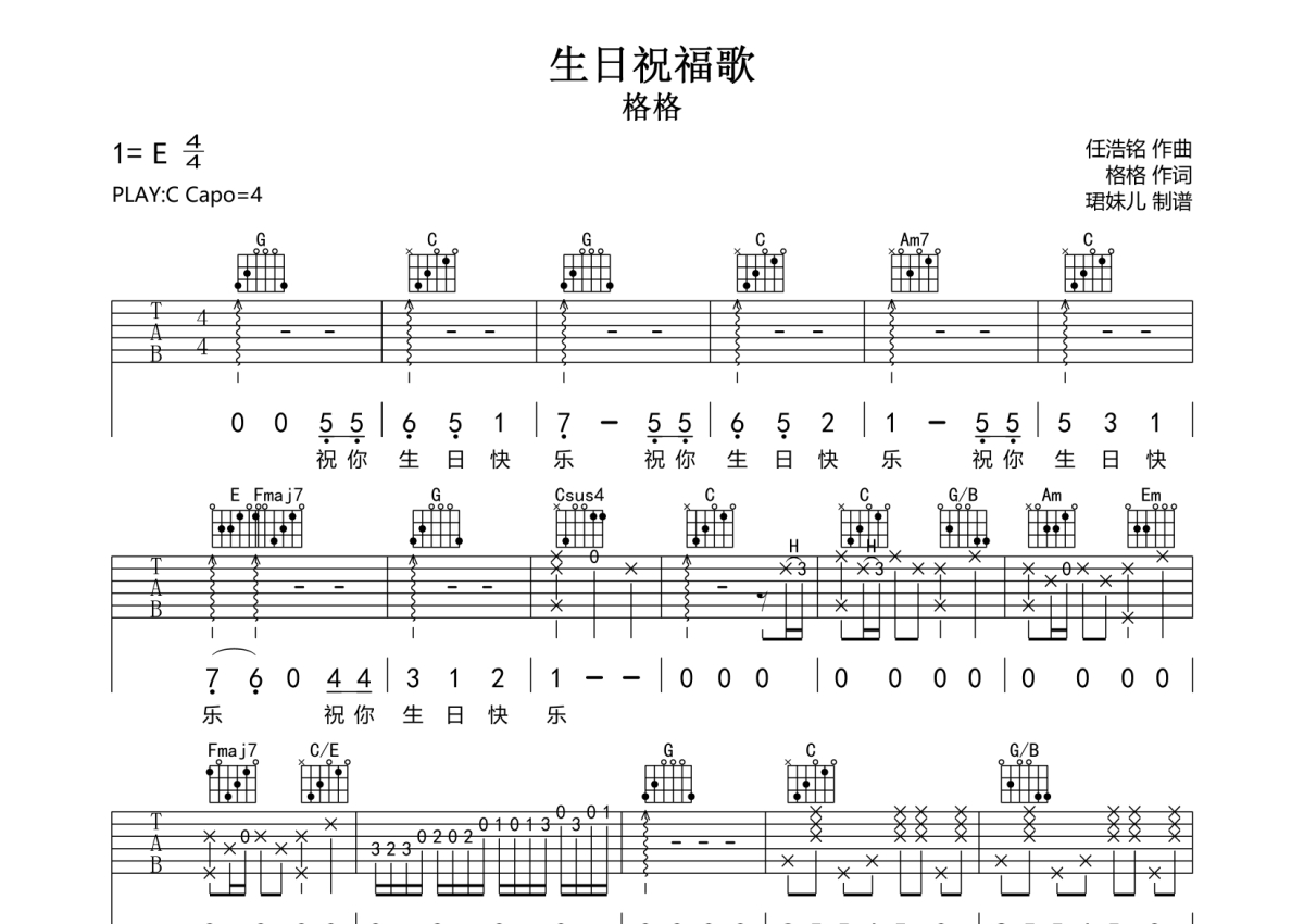 《生日祝福歌》是格格演唱的一首歌曲,拍号为4/4拍,歌曲速度为每分钟85拍,歌曲原调为E调,但由于原调指法比较难,为了方便弹奏,本吉他谱采用的是C调指法编配,变调夹4品弹奏即为原调,当然也可以根据自己的音域改变变调夹位置,或者通过改变和弦调性,以方便自己弹奏,这份吉他谱共有三张高清图谱,图谱由 @珺妹儿 编配上传,图谱使用六线谱编配,包含吉他和弦指法、简谱以及歌词部分,使用这份生日祝福歌吉他谱,可以让你更加方便地掌握这首歌曲的弹唱技巧,快来尝试吧。