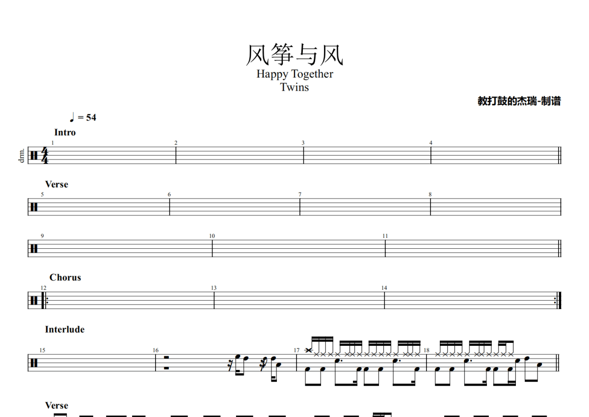 《风筝与风》是Twins演唱的一首歌曲,Happy Together,拍号为4/4拍,歌曲速度为每分钟54拍,这份架子鼓谱共有两张高清图谱,图谱由 @Jerry 编配上传,图谱使用五线谱编配,使用这份风筝与风架子鼓谱,你将能够轻松地敲打出这首Twins的风筝与风,快来尝试吧。