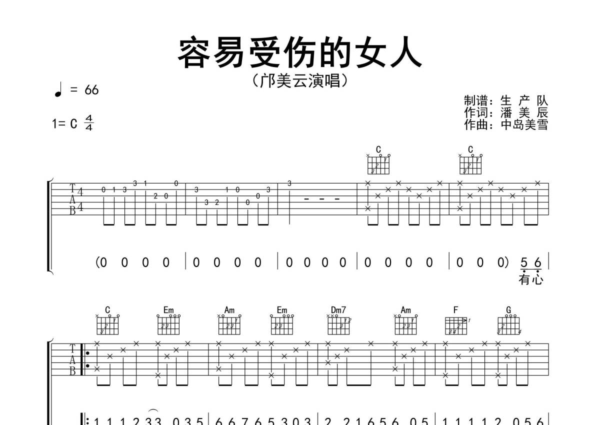 《容易受伤的女人》是完美版演唱的一首歌曲,精编完美版,拍号为4/4拍,歌曲速度为每分钟66拍,歌曲原调为C调,本吉他谱采用的是C调指法编配,演奏时不需要使用变调夹即为原调,这份吉他谱共有三张高清图谱,图谱由 @生产队 编配上传,图谱使用六线谱编配,包含吉他和弦指法、简谱以及歌词部分,使用这份容易受伤的女人吉他谱,可以让你更加方便地掌握这首歌曲的弹唱技巧,快来尝试吧。《容易受伤的女人》是中国香港女歌手邝美云演唱的普通话经典歌曲,收录在同名专辑中。本吉他谱根据原版C调指法编配,完整的前奏、间奏、尾奏及SOLO编配,怀旧经典!。