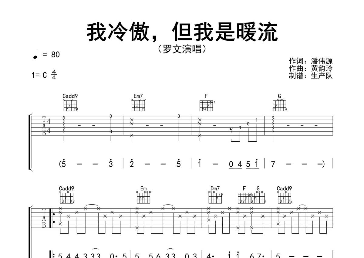 《我冷傲,但我是暖流》是罗文演唱的一首歌曲,精编完美版,拍号为4/4拍,歌曲速度为每分钟80拍,歌曲原调为C调,本吉他谱采用的是C调指法编配,演奏时不需要使用变调夹即为原调,这份吉他谱共有三张高清图谱,图谱由 @生产队 编配上传,图谱使用六线谱编配,包含吉他和弦指法、简谱以及歌词部分,使用这份我冷傲,但我是暖流吉他谱,可以让你更加方便地掌握这首歌曲的弹唱技巧,快来尝试吧。《我冷傲,但我是暖流》是由黄韵玲作曲,潘伟源作词,罗文演唱的精品歌曲,收录在《罗文精品十三》专辑中。本吉他谱根据C调指法编配,完整的前奏、间奏编配,怀旧经典!。
