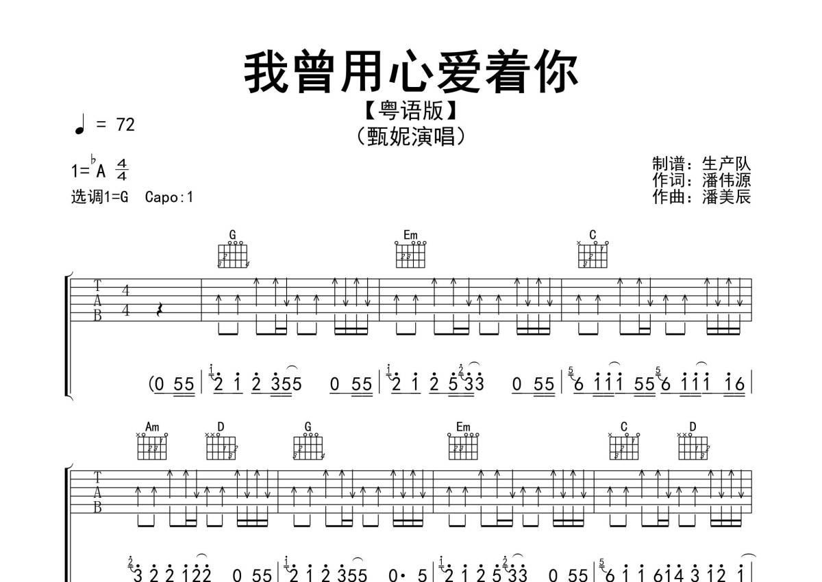 《我曾用心爱着你(粤语版)》是粤语版演唱的一首歌曲,精编完美版,拍号为4/4拍,歌曲速度为每分钟72拍,歌曲原调为Ab调,但由于原调指法比较难,为了方便弹奏,本吉他谱采用的是G调指法编配,变调夹1品弹奏即为原调,当然也可以根据自己的音域改变变调夹位置,或者通过改变和弦调性,以方便自己弹奏,这份吉他谱共有三张高清图谱,图谱由 @生产队 编配上传,图谱使用六线谱编配,包含吉他和弦指法、简谱以及歌词部分,使用这份我曾用心爱着你(粤语版)吉他谱,可以让你更加方便地掌握这首歌曲的弹唱技巧,快来尝试吧。《我曾用心爱着你》(粤语版)是由潘伟源作词,潘美辰作曲,甄妮演唱的经典歌曲,收录在其于1989年1月1日发行的专辑《今夜又被软化》。本吉他谱根据原版采用G调指法编配,精准的前奏,间奏,尾奏及SOLO编配,精编完美版本,怀旧经典!。