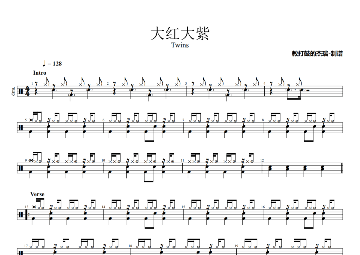 《大红大紫》是Twins演唱的一首歌曲,拍号为4/4拍,歌曲速度为每分钟128拍,这份架子鼓谱共有三张高清图谱,图谱由 @Jerry 编配上传,图谱使用五线谱编配,使用这份大红大紫架子鼓谱,你将能够轻松地敲打出这首Twins的大红大紫,快来尝试吧。