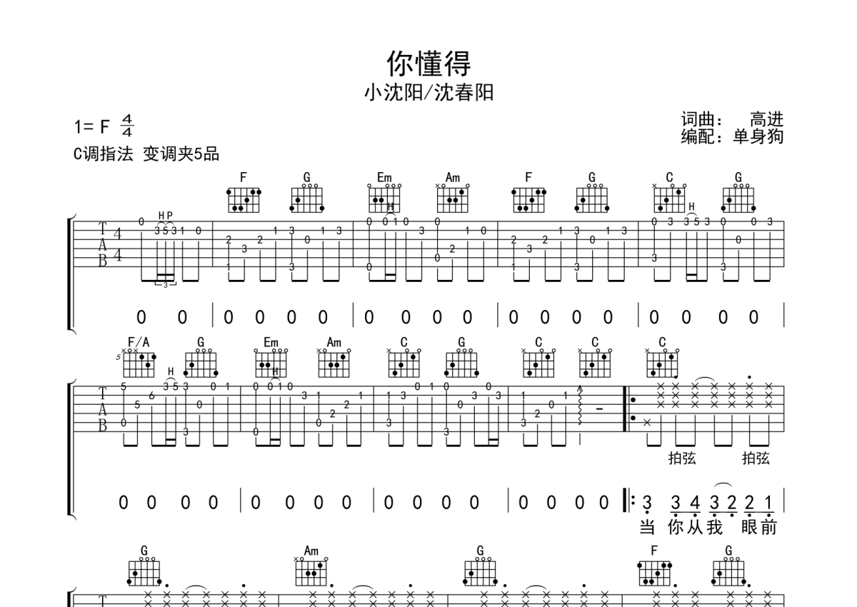 《你懂得》是小沈阳/沈春阳演唱的一首歌曲,拍号为4/4拍,歌曲原调为F调,但由于原调指法比较难,为了方便弹奏,本吉他谱采用的是C调指法编配,变调夹5品弹奏即为原调,当然也可以根据自己的音域改变变调夹位置,或者通过改变和弦调性,以方便自己弹奏,这份吉他谱共有三张高清图谱,图谱由 @单身狗 编配上传,图谱使用六线谱编配,包含吉他和弦指法、简谱以及歌词部分,使用这份你懂得吉他谱,可以让你更加方便地掌握这首歌曲的弹唱技巧,快来尝试吧。