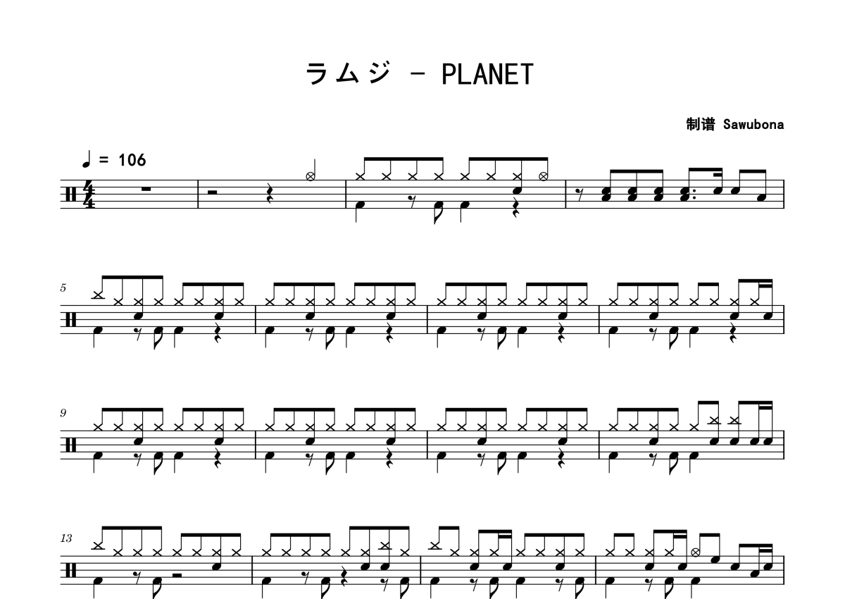 《PLANET》是ラムジ演唱的一首歌曲,拍号为4/4拍,歌曲速度为每分钟106拍,这份架子鼓谱共有三张高清图谱,图谱由 @Sawubona 编配上传,图谱使用五线谱编配,使用这份PLANET架子鼓谱,你将能够轻松地敲打出这首ラムジ的PLANET,快来尝试吧。