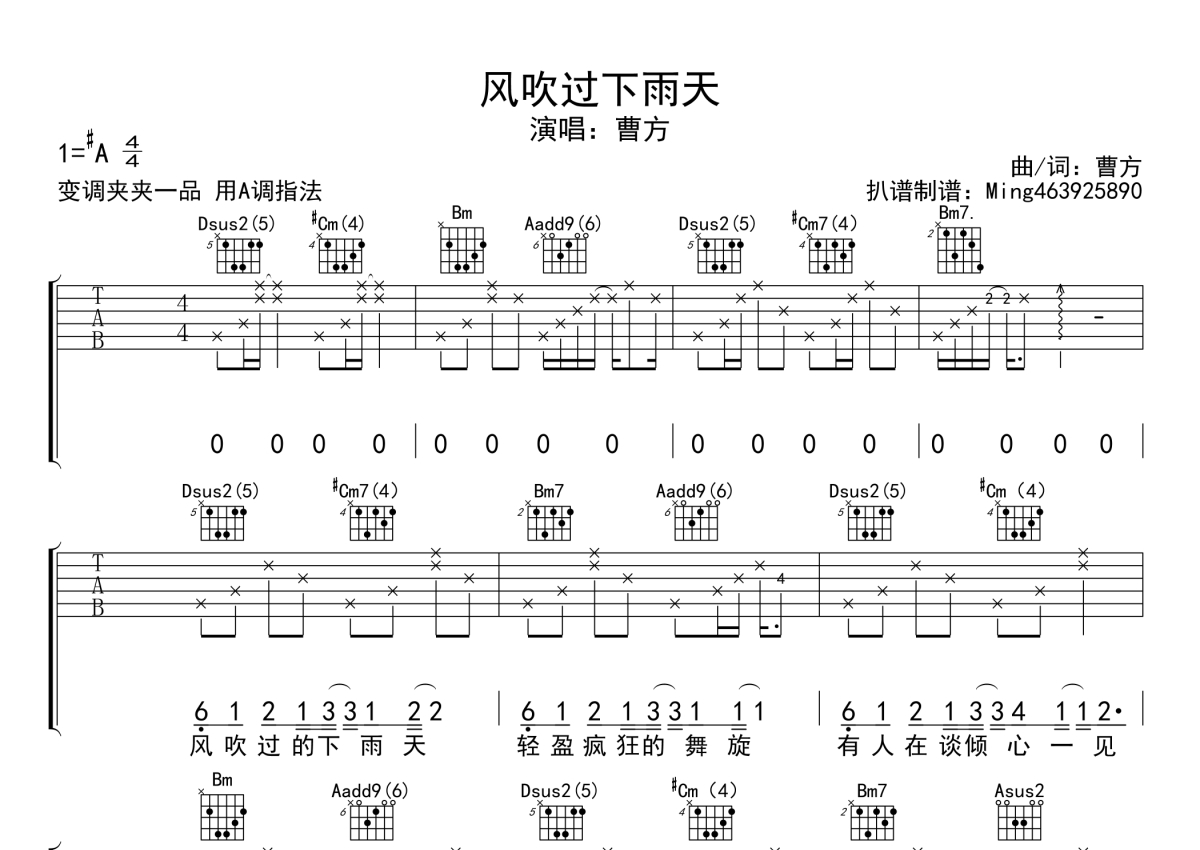 《风吹过下雨天》是曹方演唱的一首歌曲,按原版扒谱制作,拍号为4/4拍,歌曲原调为Bb调,但由于原调指法比较难,为了方便弹奏,本吉他谱采用的是A调指法编配,变调夹1品弹奏即为原调,当然也可以根据自己的音域改变变调夹位置,或者通过改变和弦调性,以方便自己弹奏,这份吉他谱共有四张高清图谱,图谱由 @-NAgfUy3P3b4 编配上传,图谱使用六线谱编配,包含吉他和弦指法、简谱以及歌词部分,使用这份风吹过下雨天吉他谱,可以让你更加方便地掌握这首歌曲的弹唱技巧,快来尝试吧。乐谱按原版吉他伴奏制作,相似度98%以上,自弹自唱有一点难度。