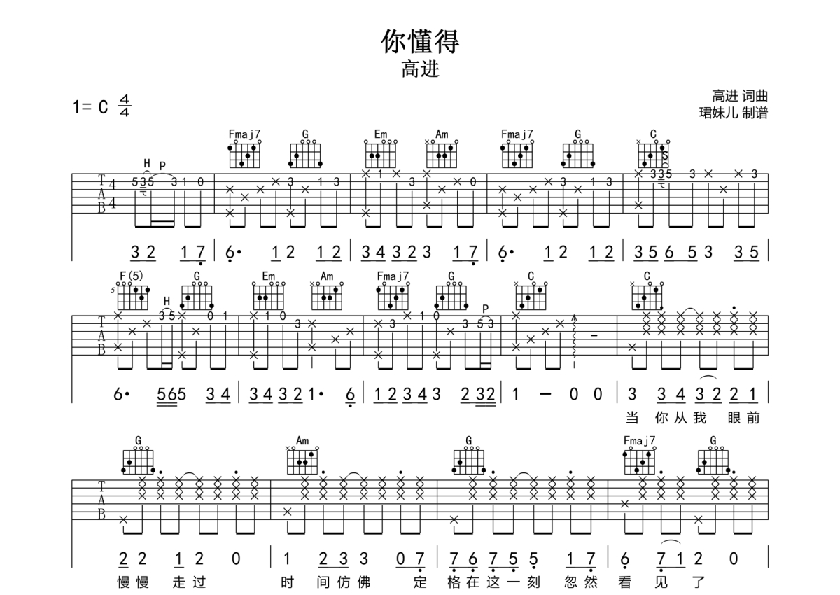 《你懂得》是小沈阳/沈春阳演唱的一首歌曲,拍号为4/4拍,歌曲速度为每分钟85拍,歌曲原调为C调,本吉他谱采用的是C调指法编配,演奏时不需要使用变调夹即为原调,这份吉他谱共有两张高清图谱,图谱由 @珺妹儿 编配上传,图谱使用六线谱编配,包含吉他和弦指法、简谱以及歌词部分,使用这份你懂得吉他谱,可以让你更加方便地掌握这首歌曲的弹唱技巧,快来尝试吧。