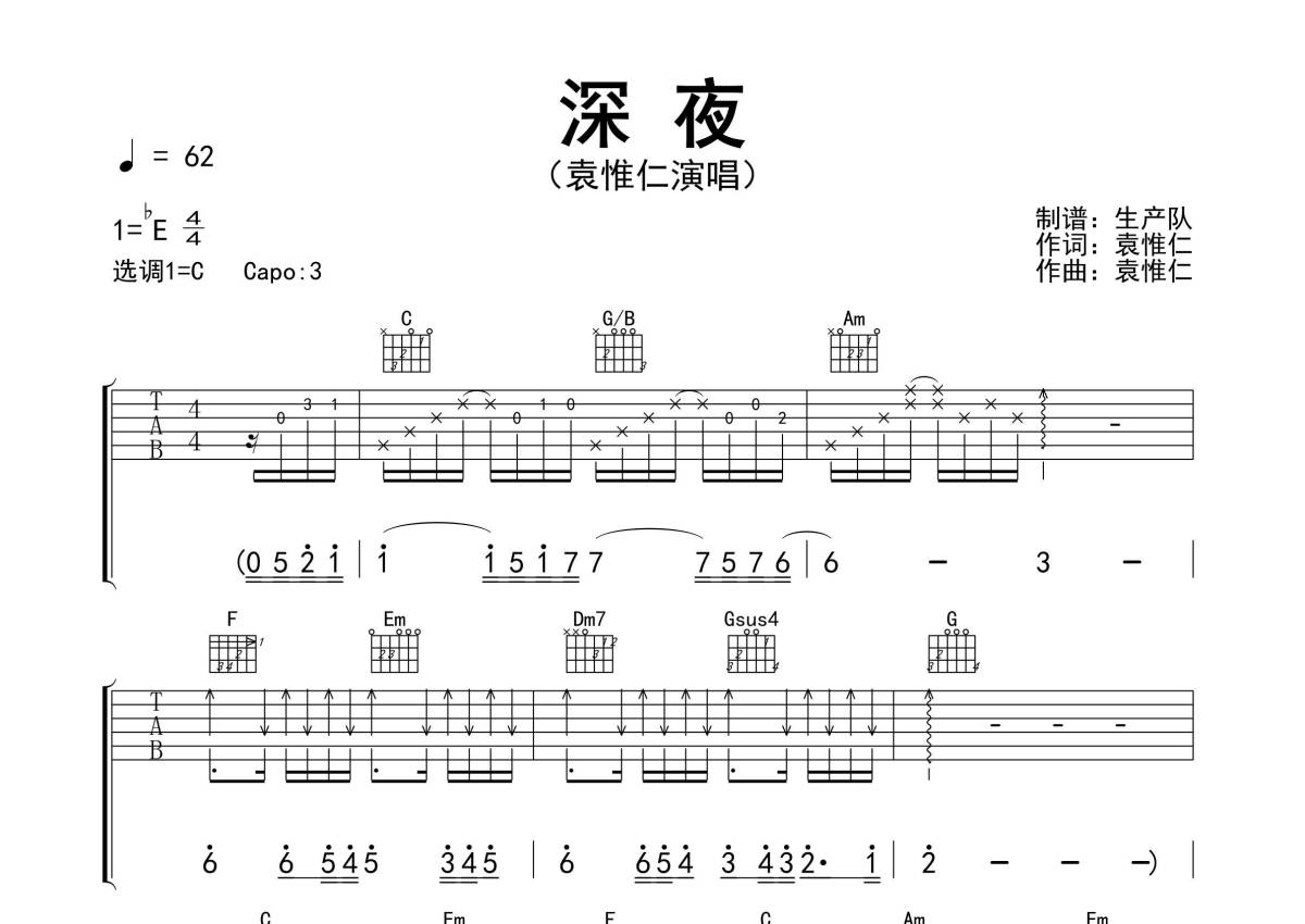 《深夜》是袁惟仁演唱的一首歌曲,精编完美版,拍号为4/4拍,歌曲速度为每分钟62拍,歌曲原调为Eb调,但由于原调指法比较难,为了方便弹奏,本吉他谱采用的是C调指法编配,变调夹3品弹奏即为原调,当然也可以根据自己的音域改变变调夹位置,或者通过改变和弦调性,以方便自己弹奏,这份吉他谱共有三张高清图谱,图谱由 @生产队 编配上传,图谱使用六线谱编配,包含吉他和弦指法、简谱以及歌词部分,使用这份深夜吉他谱,可以让你更加方便地掌握这首歌曲的弹唱技巧,快来尝试吧。《深夜》是由袁惟仁作词、作曲并演唱的经典歌曲,该曲也是《执迷不悔》的国语版。本吉他谱根据原版C调指法编配,精准的前奏、间奏、尾奏编配,注意体会Bass的走向和魅力,怀旧经典!。