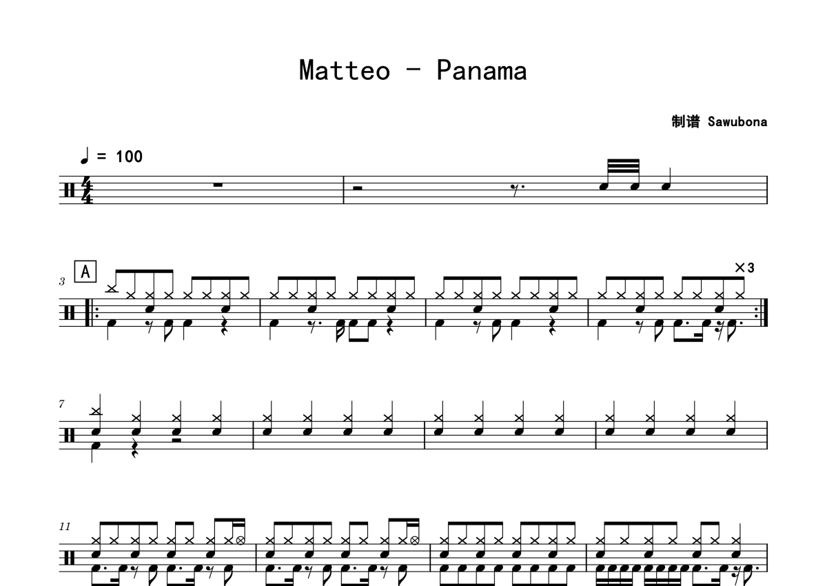 《Panama》是Matteo演唱的一首歌曲,拍号为4/4拍,歌曲速度为每分钟100拍,这份架子鼓谱共有两张高清图谱,图谱由 @Sawubona 编配上传,图谱使用五线谱编配,使用这份Panama架子鼓谱,你将能够轻松地敲打出这首Matteo的Panama,快来尝试吧。