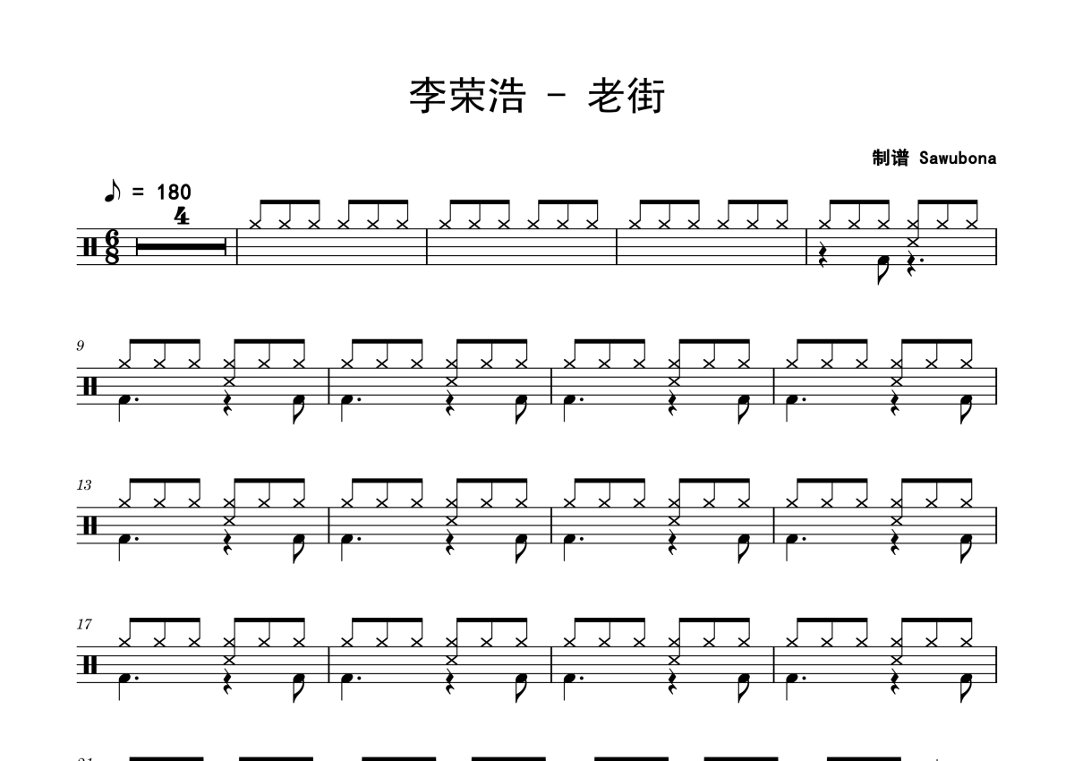 《老街》是李荣浩演唱的一首歌曲,拍号为4/4拍,歌曲速度为每分钟180拍,这份架子鼓谱共有四张高清图谱,图谱由 @Sawubona 编配上传,图谱使用五线谱编配,使用这份老街架子鼓谱,你将能够轻松地敲打出这首李荣浩的老街,快来尝试吧。