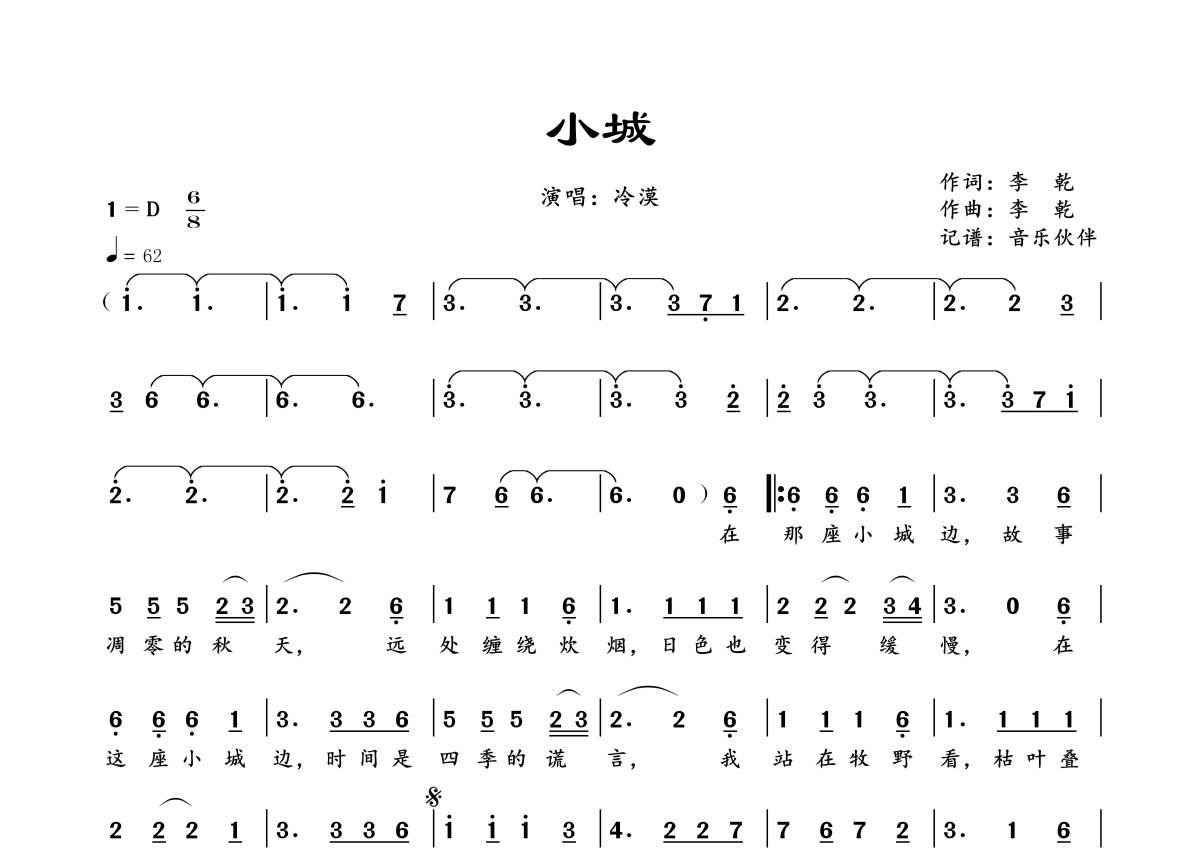 《小城》是冷漠演唱的一首歌曲,拍号为6/8拍,歌曲速度为每分钟62拍,这份简谱共有一张高清图谱,图谱由 @音乐伙伴 编配上传。
