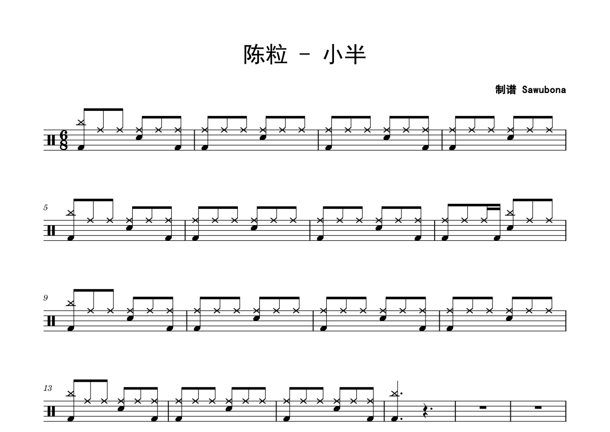 《小半》是陈粒演唱的一首歌曲,拍号为6/8拍,这份架子鼓谱共有三张高清图谱,图谱由 @Sawubona 编配上传,图谱使用五线谱编配,使用这份小半架子鼓谱,你将能够轻松地敲打出这首陈粒的小半,快来尝试吧。